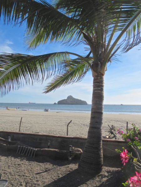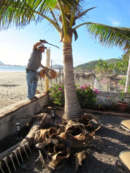 We asked Ismael to trim our palm tree last Saturday. He trimmed all you can see and more. As the branches die they fall off but several bits remain attached to the tree.  I imagine that over time they would fall off as well. We had Ismael trim down to the level of his left hand.