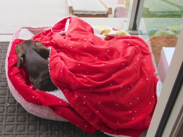 The next morning, Monday the 12th it was so chilly when we got up that Colin lit the pilot light for the fireplace and turned it on. Carlie under the fireplace all wrapped up.